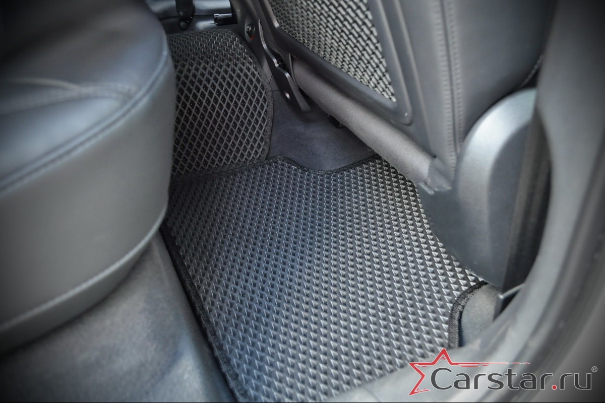Толщина ковриков EVA составляет 10-12 мм. Глубина ячеек 7-8 мм. Такая толщина ковриков позволяет им служить довольно долго, не протираясь до 3 лет. А благодаря такой глубине ячеек коврик EVA площадью 1 кв.м. способен захватить около 3,5 л жидкости, сохраняя в чистоте вашу обувь и обивку салона.