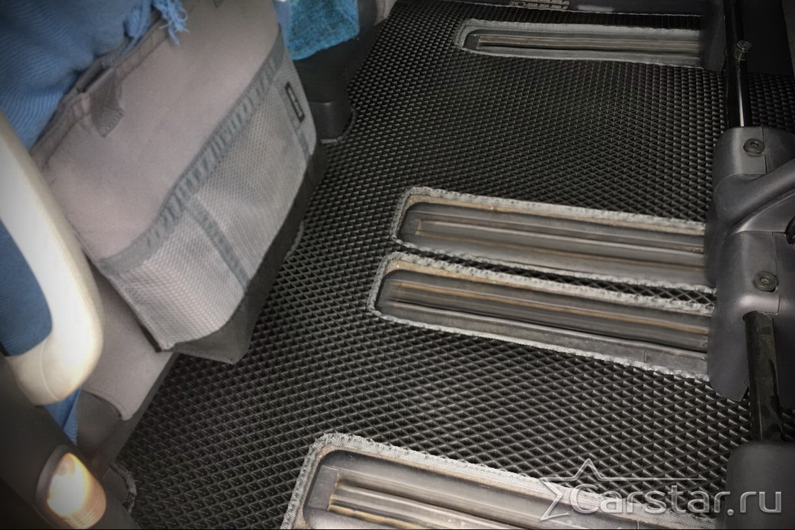 Толщина ковриков EVA составляет 10-12 мм. Глубина ячеек 7-8 мм. Такая толщина ковриков позволяет им служить довольно долго, не протираясь до 3 лет. А благодаря такой глубине ячеек коврик EVA площадью 1 кв.м. способен захватить около 3,5 л жидкости, сохраняя в чистоте вашу обувь и обивку салона.