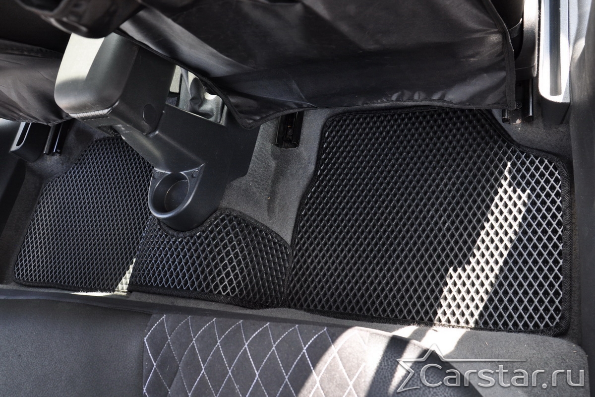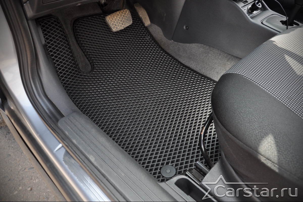 Толщина ковриков EVA составляет 10-12 мм. Глубина ячеек 7-8 мм. Такая толщина ковриков позволяет им служить довольно долго, не протираясь до 3 лет. А благодаря такой глубине ячеек коврик EVA площадью 1 кв.м. способен захватить около 3,5 л жидкости, сохраняя в чистоте вашу обувь и обивку салона.