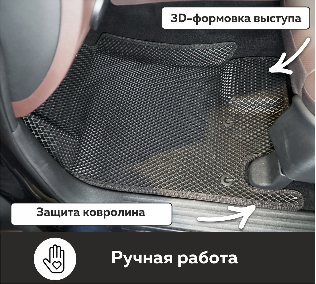 Толщина ковриков EVA составляет 10-12 мм. Глубина ячеек 7-8 мм. Такая толщина ковриков позволяет им служить довольно долго, не протираясь до 3 лет. А благодаря такой глубине ячеек коврик EVA площадью 1 кв.м. способен захватить около 3,5 л жидкости, сохраняя в чистоте вашу обувь и обивку салона.