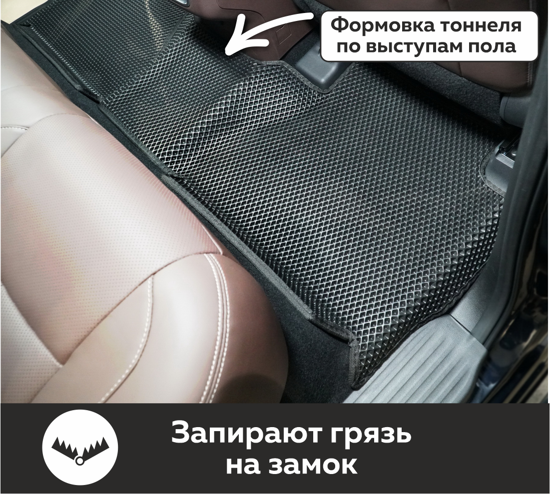 Изделия EVA имеют специальную ячеистую структуру (ячейки глубиной 8 мм), которая эффективно задерживает грязь и воду, оставляя вашу обувь и поверхность обивки салона или багажника абсолютно чистыми. Также эти ячейки очень легко и быстро очищаются без применения специальных инструментов, в том числе, при помощи бесконтактной мойки.