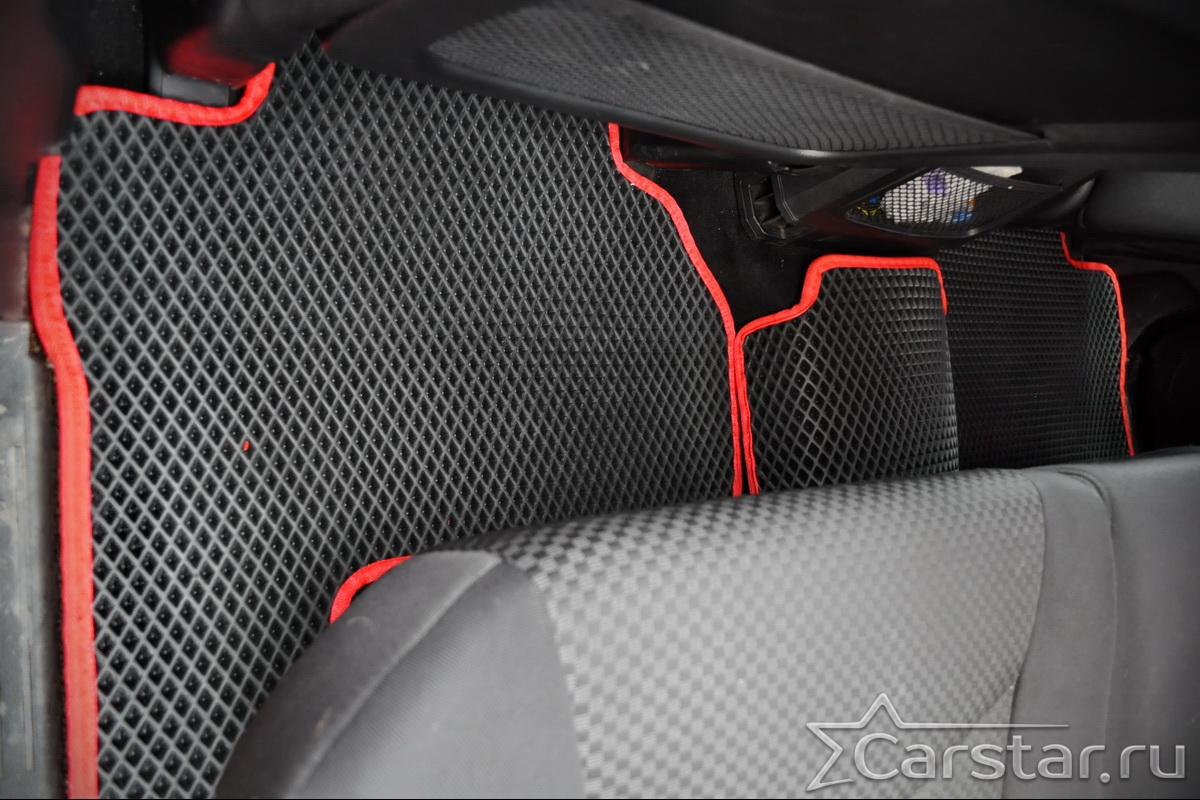 Толщина ковриков EVA составляет 10-12 мм. Глубина ячеек 7-8 мм. Такая толщина ковриков позволяет им служить довольно долго, не протираясь до 3 лет. А благодаря такой глубине ячеек коврик EVA площадью 1 кв.м. способен захватить около 3,5 л жидкости, сохраняя в чистоте вашу обувь и обивку салона.