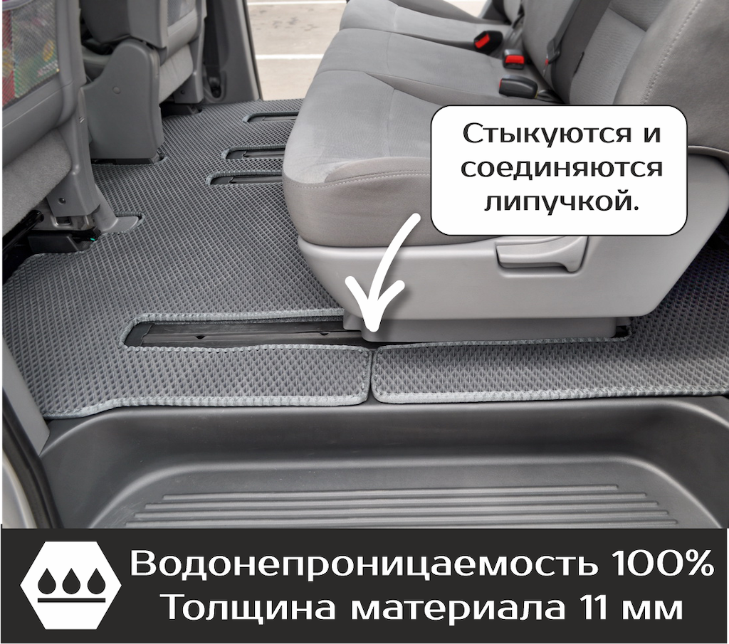 Нижняя часть ковра изготавливается из термопластичной резины с шипами 2-3 мм по всей поверхности, что предотвращает скольжение коврика по салону автомобиля.
